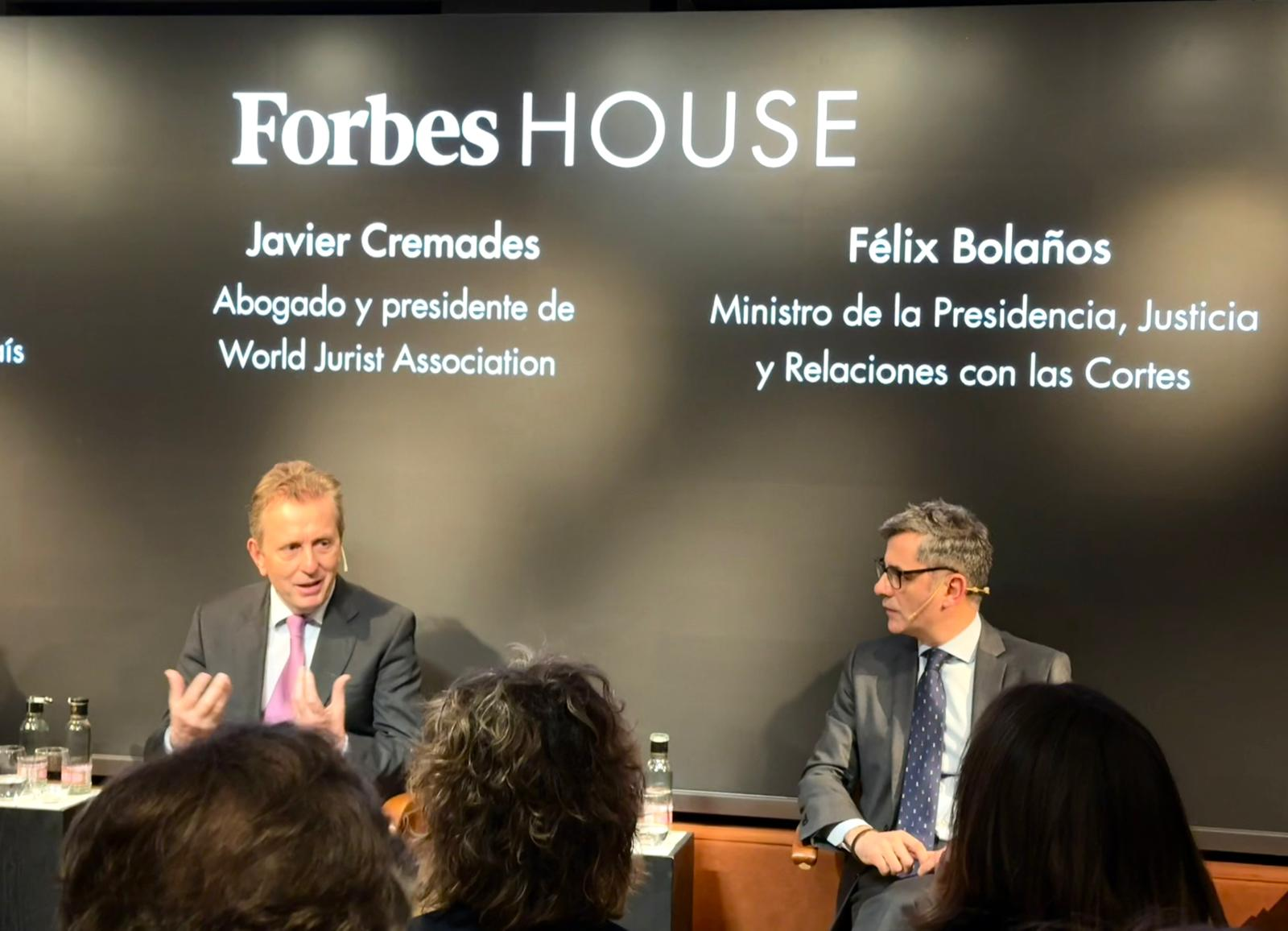 El ministro de la Presidencia, Justicia y Relaciones con las Cortes, Félix Bolaños, durante un coloquio con motivo de la publicación del libro ‘Sobre el imperio de la ley’, del presidente de la World Jurist Association y de la World Law Foundation, Javier Cremades, en Forbes House, a 23 de febrero de 2026, en Madrid (España). En ‘Sobre el imperio de la ley’, Cremades propone una reflexión sobre la solidez de las instituciones democráticas en un contexto marcado por la polarización política, la transformación tecnológica y las tensiones geopolíticas.