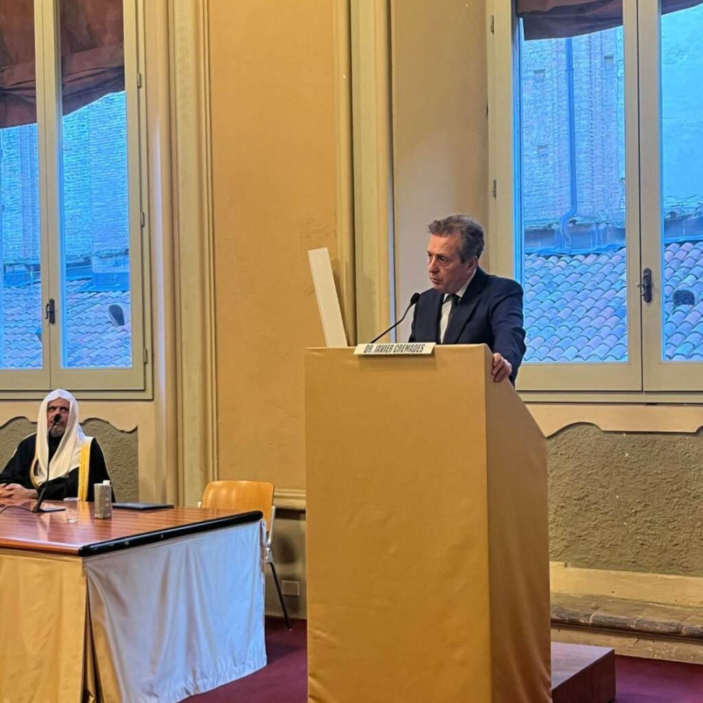 Gracias a Luca Mezzetti, al profesor Marco Cavina, al rector de la Universidad Giovanni Molari, a Anna Lisa Boni, Rita Monticello, al Decano del Colegio de Abogados de Bolonia, y a todas las autoridades académicas y locales que estuvieron presentes. Gracias al Secretario General de la Muslim World League, Mohammed Al Issa, que también recibió el mismo grado honorario.
