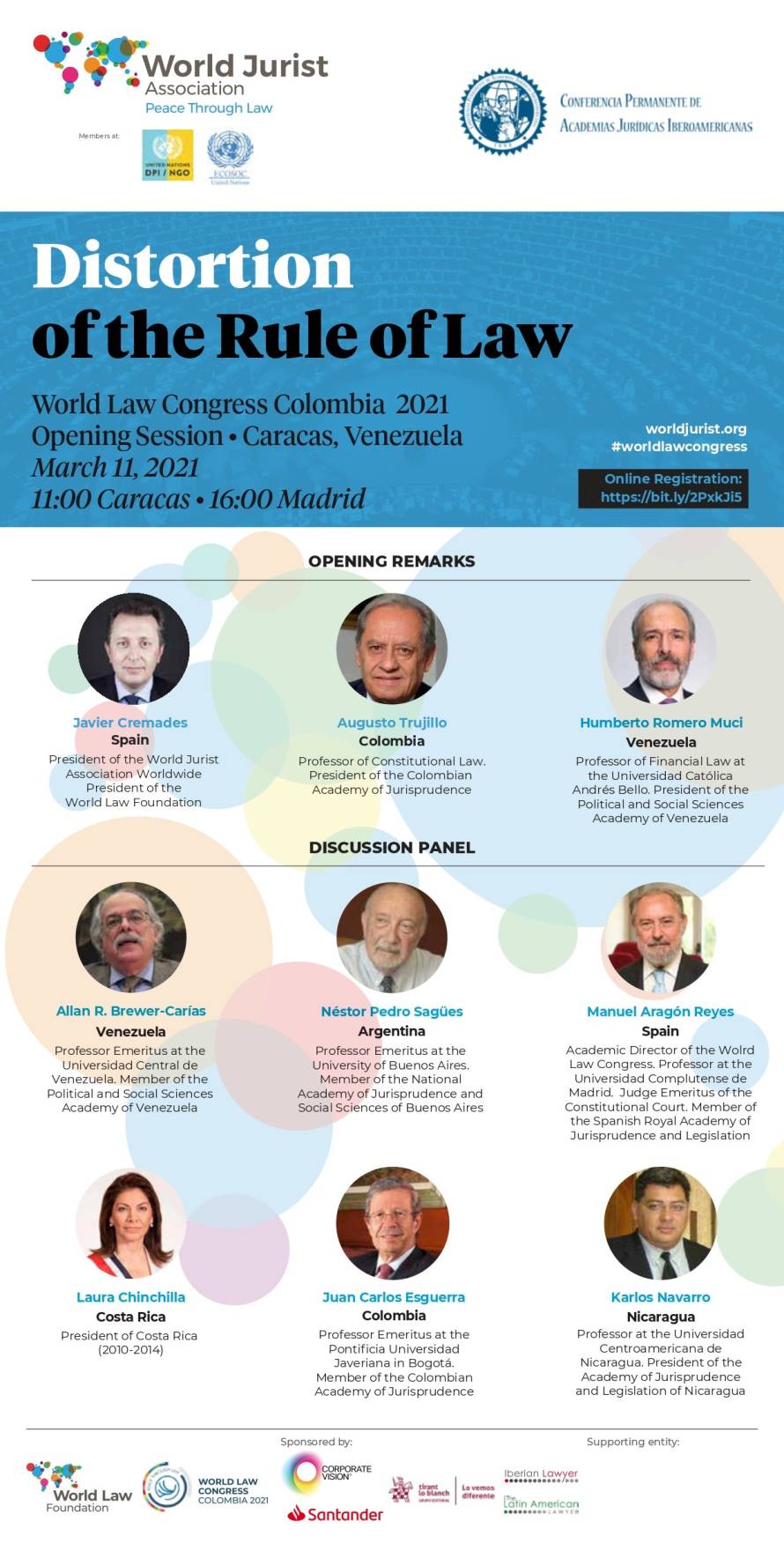 En el panel de discusión intervendrán destacados juristas, incluyendo a Laura Chinchilla, presidenta de Costa Rica (2010-2014), Allan R. Brewer-Carías, profesor emérito de la Universidad Central de Venezuela y miembro de la Academia de Ciencias Políticas y Sociales de Venezuela, y Manuel Aragón Reyes, director académico del World Law Congress, profesor en la Universidad Complutense de Madrid, juez emérito de la Corte Constitucional de España y miembro de la Real Academia Española de Jurisprudencia y Legislación,.