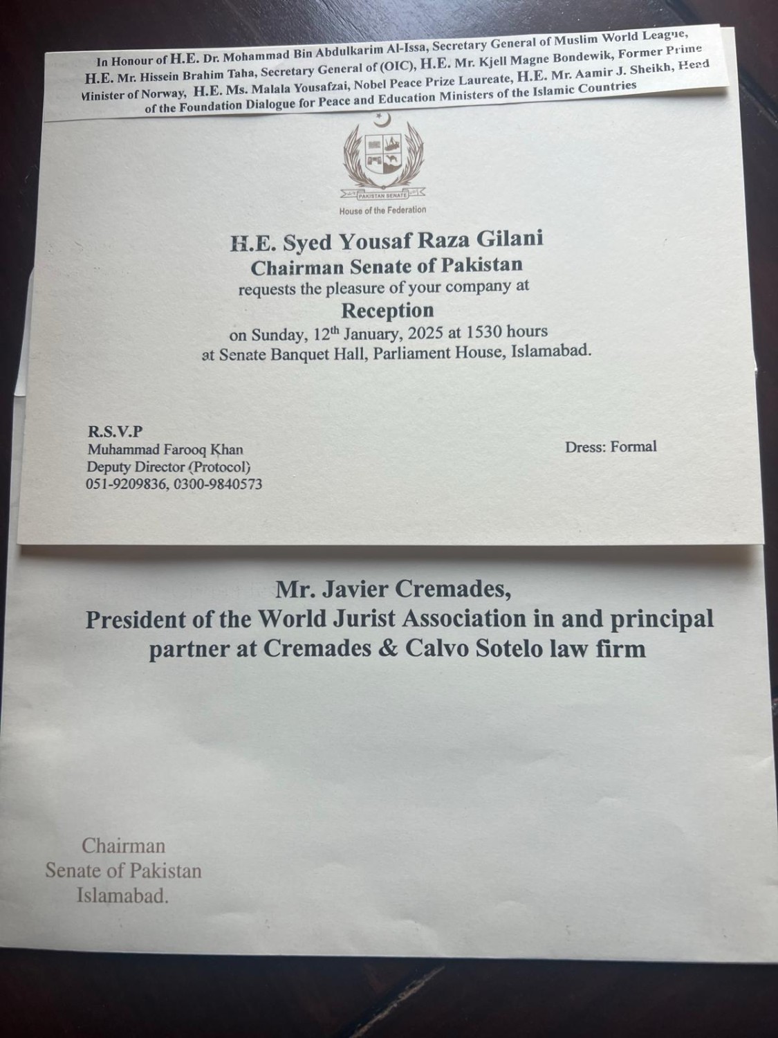 Pude visitar el país entre el 9 y el 13 de enero de 2025. Fui acompañado de mi amigo y compañero Diego Solana Giménez y de mi hijo Álvaro Cremades. Participé en un congreso sobre el liderazgo de mujeres jóvenes en las sociedades islámicas. Estaba organizado por el Primer Ministro de Pakistán y el Secretario General de la Muslim World League, Mohammed Al-Issa. Malala, la joven premio Nobel de la Paz, era la oradora principal.