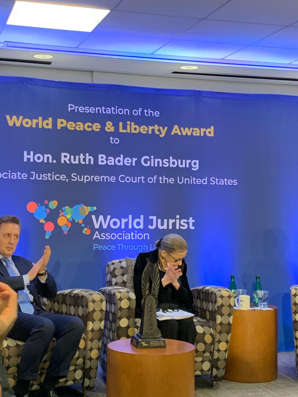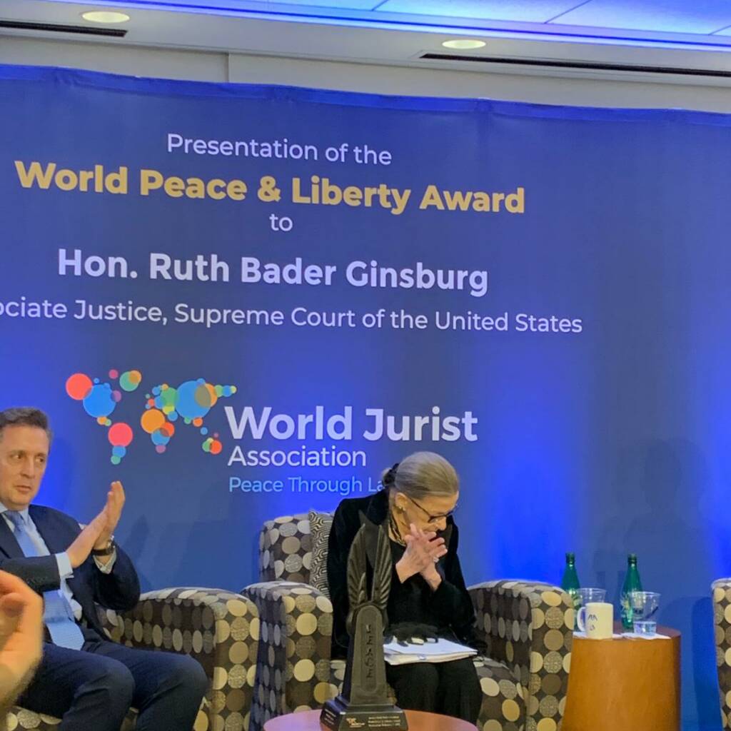 La World Jurist Association, junto con la World Law Foundation, entrega el `World Peace & Liberty Award’ a la jurista Ruth Bader Ginsburg, segunda mujer en la historia estadounidense en ocupar el cargo de Magistrada de la Corte Suprema de los Estados Unidos. Un galardón que reconoce su encomiable defensa de la igualdad de género y los derechos civiles a lo largo de su vida profesional, al también fundar la sección de derechos de la mujer dentro de la Unión Estadounidense por las Libertades Civiles.