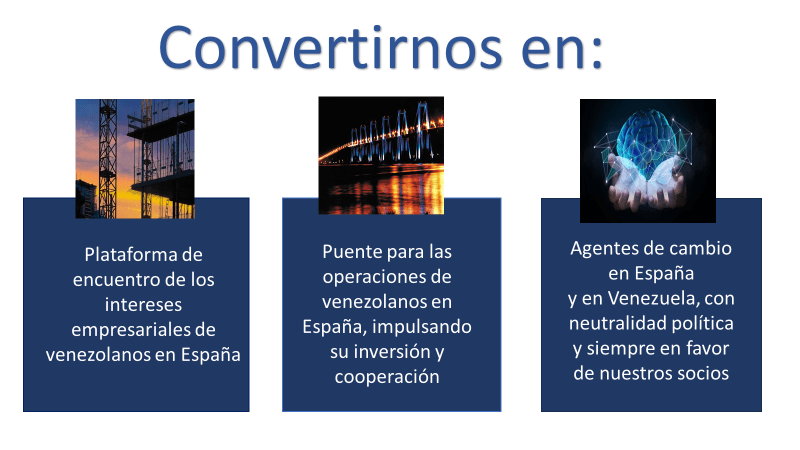 La Cámara de Empresarios Venezolanos en España se fundamenta en tres pilares esenciales: colaboración, crecimiento e integración. A través de programas de mentoría, eventos de networking, conferencias y alianzas estratégicas, busca nutrir el ecosistema empresarial, fomentando la innovación y el espíritu emprendedor.